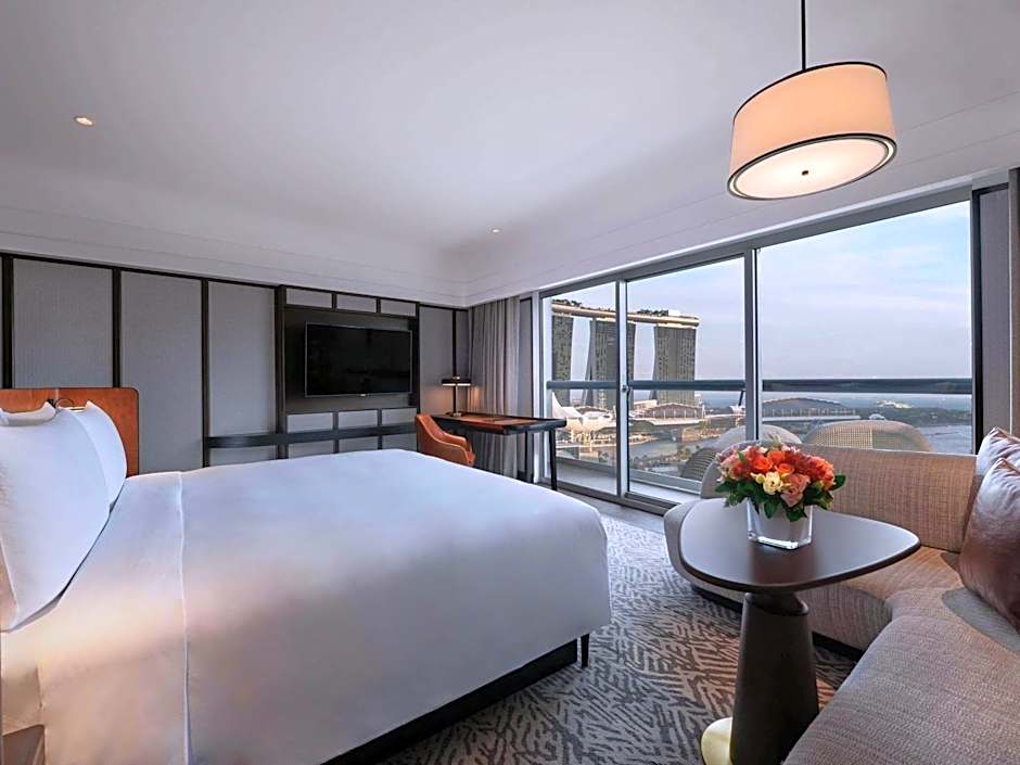 This room features a balcony with Marina Bay view, rainshower, a soaking bath, Nespresso coffee machine and TWG tea. Kindly note that the actual layout of, and view from the room may vary from the image displayed